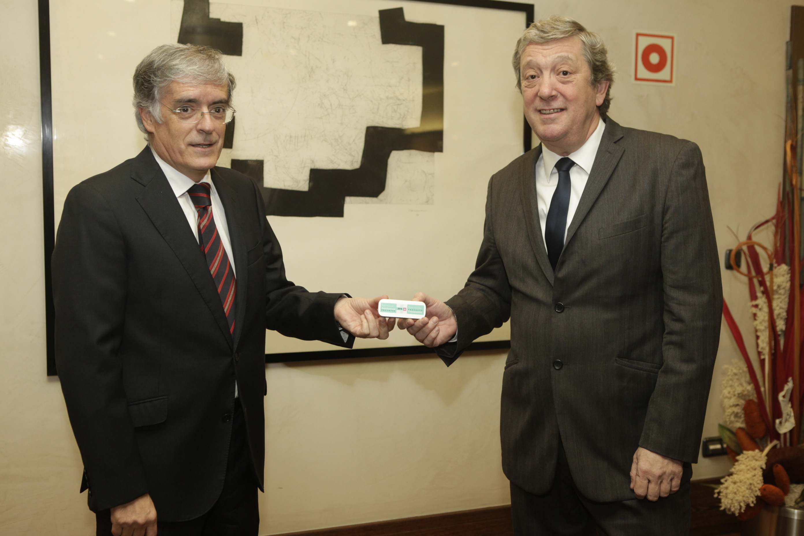 Arabako Biltzar Nagusietako presidenteak, Pedro Elosegi jaunak Ogasun, Finantza eta Aurrekontu Saileko Foru Diputatu José Luis Cimiano jaunaren eskutik, Arabako Lurralde Historikoko 2016rako Aurrekontuen Foru Arauaren Proiektua jaso du.